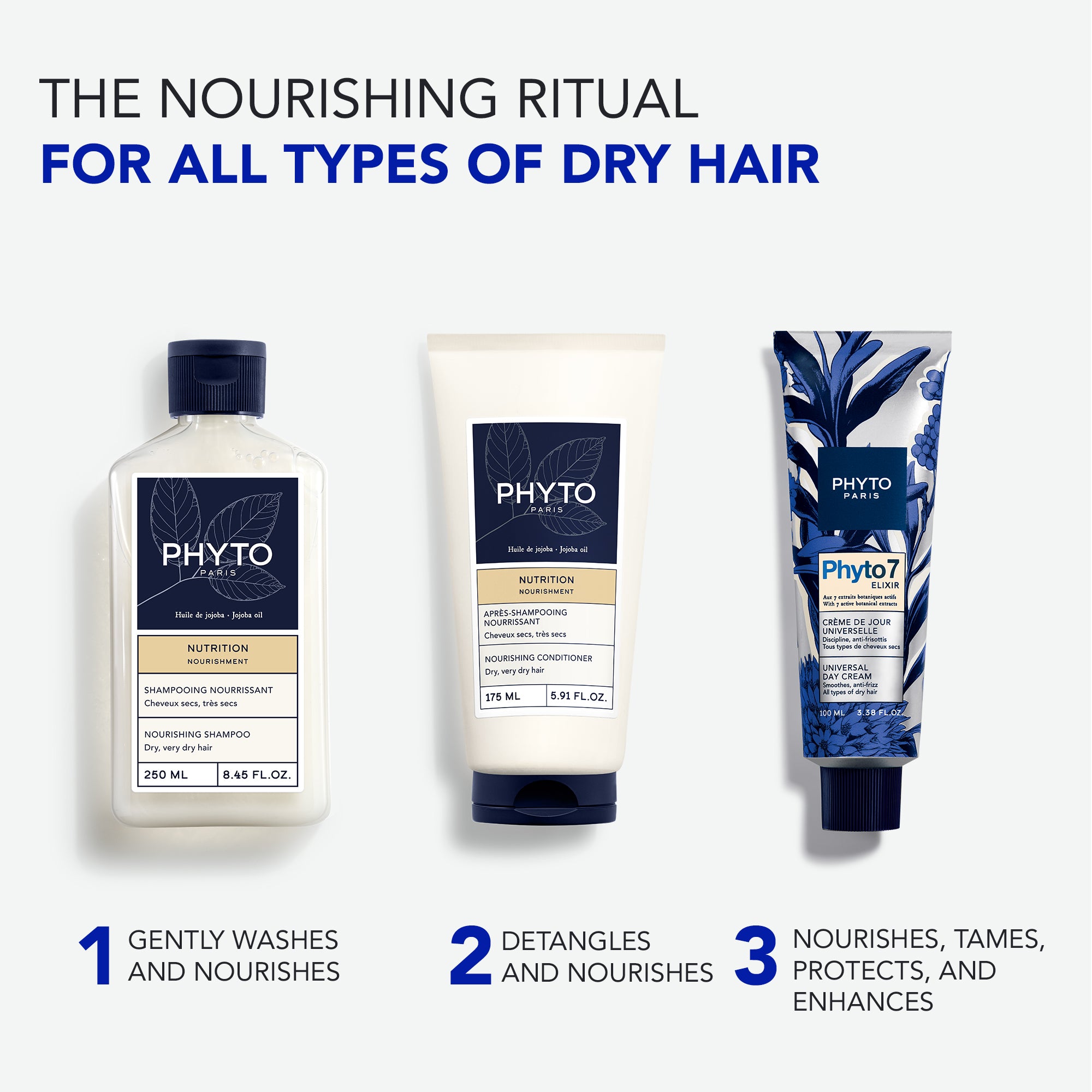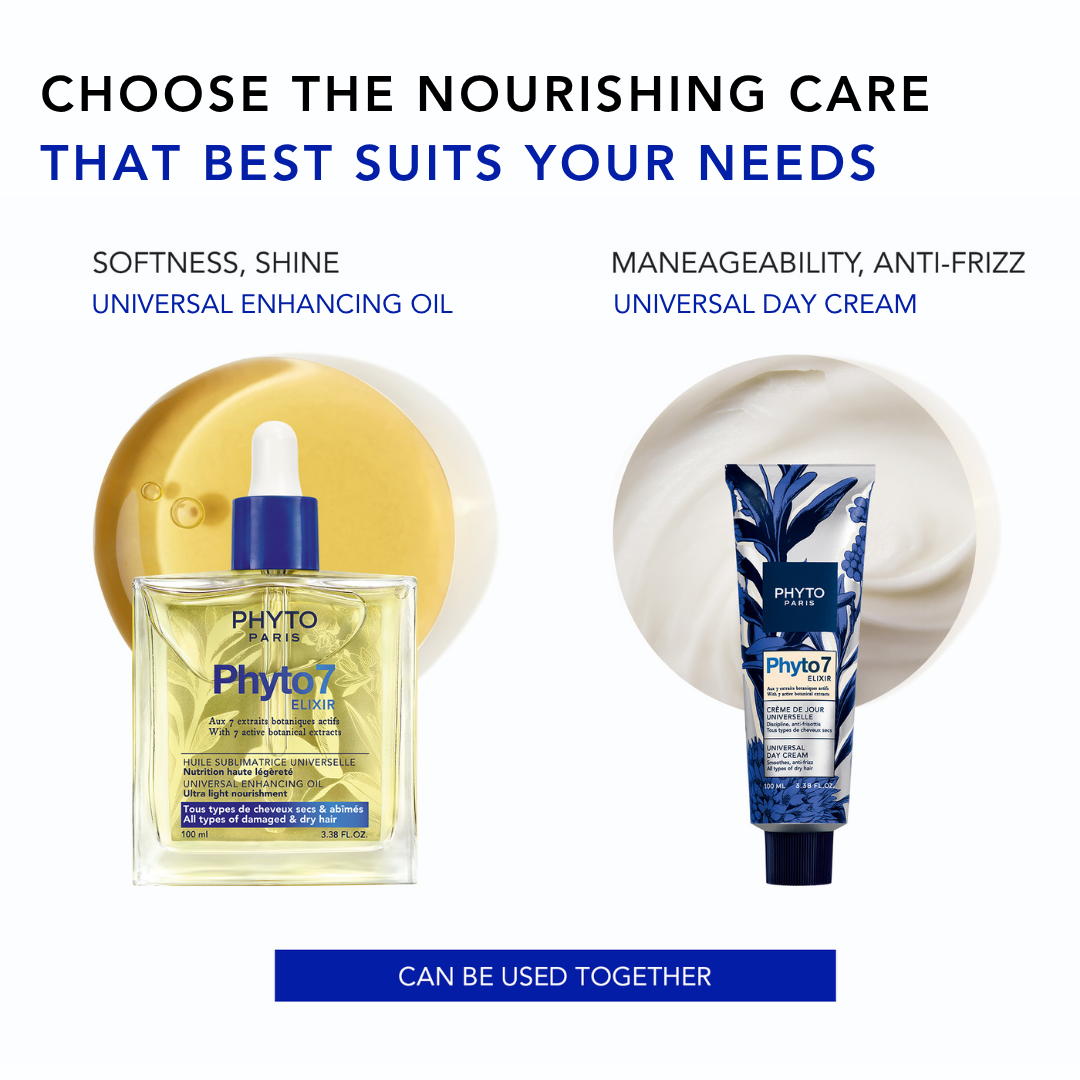 The PHYTO 7 Universal Day Cream is a leave-in cream for all dry hair types that helps soften, smooth, and visibly tame frizz without weighing hair down.